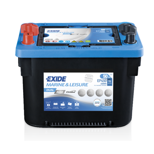 Exide DUAL AGM baterijska linija je zasnovana za čolne in prikolice z eno baterijsko banko za vse potrošnike. Primeren je tudi za dodatne baterije, ki se neposredno priključujejo električnim vitlom, potisnikom in motorjem za trolanje. Baterije se med uporabo delno izpraznijo. Ojačana zasnova DUAL AGM, skupaj z dobrim postopkom polnjenja, je ključna za najboljši rezultat in življenjsko dobo.