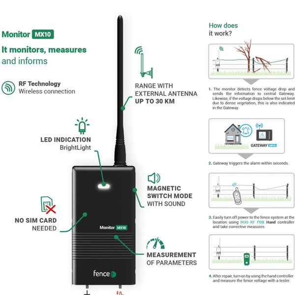 Monitor MX10 se lahko poveže s »fenceeCloud« z uporabo daljinskega upravljalnika WiFi GATEWAY GW100, kar omogoča daljinsko upravljanje prek aplikacije na mobilnem telefonu ali računalniku.