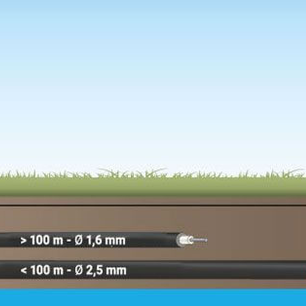 Visokonapetostni alu kabel za povezavo električne ograje in njene ozemljitve. Primeren za podzemne in nadzemne vode do 100 m. Kabel se lahko uporablja kot dovodni in kot ozemljitveni kabel. Napetost do 20 kV.Upornost: 0,013 Ω/m.Premer jedra: 1,6 mm. Dvojna izolacija.Cena za 100 m.