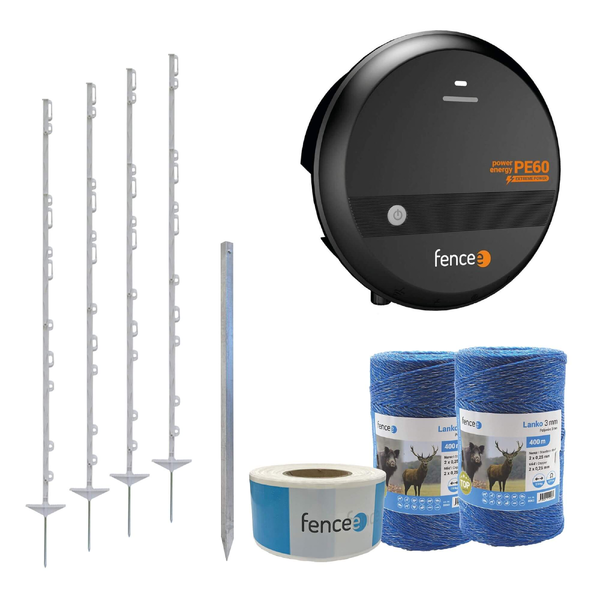 Popoln komplet električne ograje za zaščito zemljišč, posevkov in pridelka pred gozdnimi živalmi in črno divjadjo. Visokozmogljiv pašni aparat fencee power energy PE60 z močnim transformatorjem in izhodno napetostjo 12 500 V. Visokokakovostna modra žica 2 kosa, Ø 3 mm, upornost le 0,17 Ω/m, dolžina 400 m. Mobilni beli plastični količki 15 kosov z ojačanim profilom omogočajo postavitev ograje do višine 136 cm nad tlemi.