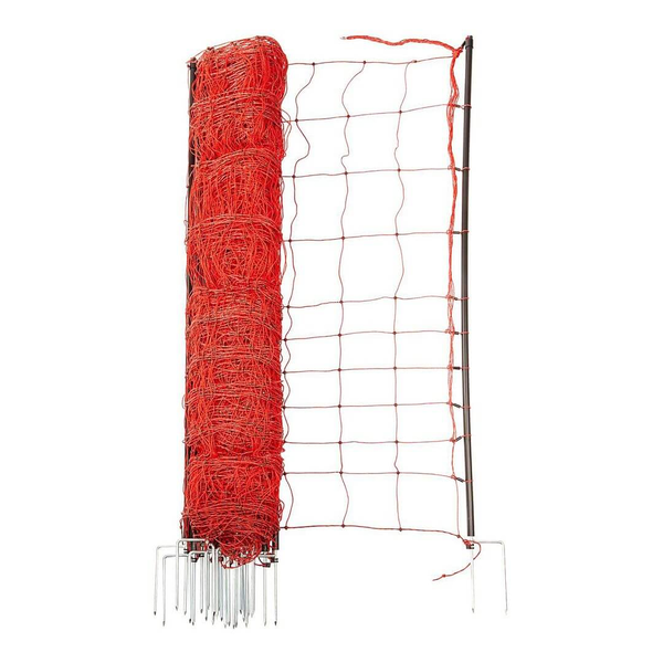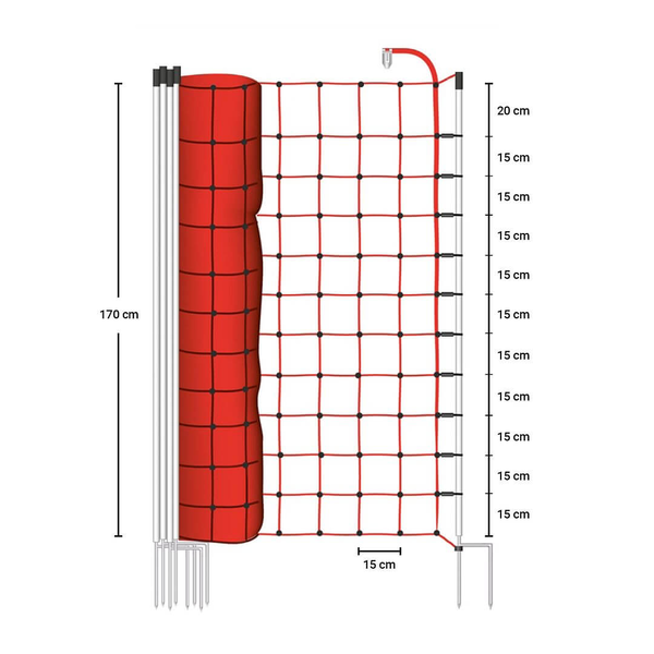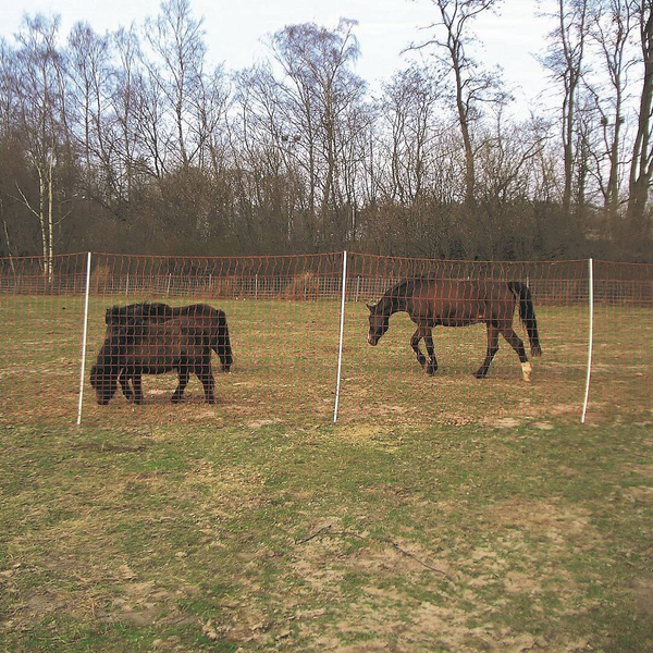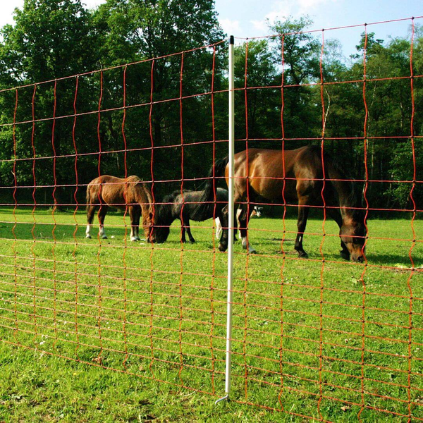 Visoka električna mreža za mobilne električne ograje za konje, ponije, osle, lame. Primerna tudi za zaščito pridelkov pred jelenjadjo in zaščito živine pred volkovi, lisicami in psi. 8 palic ∅ 19 mm z dvojno konico za dobro stabilnost višje mreže tudi v zahtevnih talnih razmerah. 11 vodoravnih vrvi, 10 žic 6 × 0.20 mm iz nerjavnega jekla.