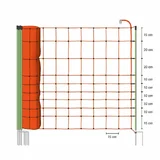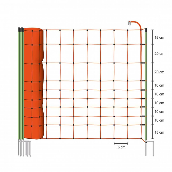 Mreža za električno ograjo, primerna za ovce. Skupaj 10 vodoravnih žic. Ojačana zgornja žica, spletena iz 24 plastičnih vlaken in 6 × 0.20 mm žic iz nerjavnega jekla. Ojačana spodnja žica brez kovinskih žic. Preostalih 8 žic vsebuje 3 × 0,20 mm žice iz nerjavnega jekla. 14 kolov z dvojnimi konicami zagotavlja stabilnost mreže tudi na neravnem terenu.