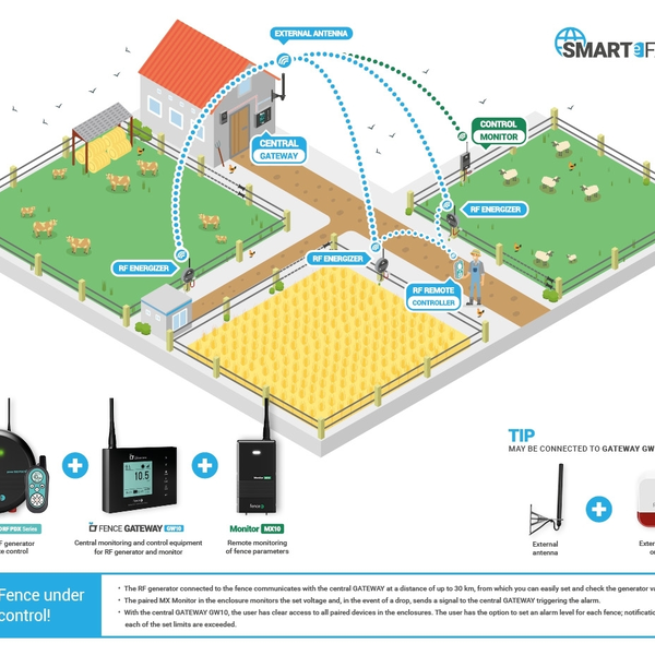 Oddaljeni prenos signala z uporabo RF tehnologije (radijska frekvenca) je povsem edinstven na svetu. To pomeni, da kartice SIM ne potrebujete več! Samo namestite pašni pastir, ga priključite in že lahko opravljate svoje delo.