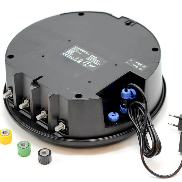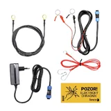 Črna ozemljitvena sponka na izhodu energizatorja, rdeča sponka za priklop polno napetostne ograje ter rumena sponka za priklop trajno znižane energijske ograje in zelena sponka za kontrolno meritev ozemljitve ograje. Napajanje iz omrežja 230 V ali baterije 12 V, ki je uporabna tudi kot rezervno napajanje.