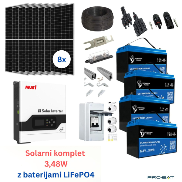 V solarnem kompletu so akumulatorji ULTIMATRON LiFePO4 Smart BMS 100Ah, ki temeljijo na tehnologiji litij železov fosfat (LiFePO4). Trenutno je to najvarnejša litijeva tehnologija. Vsaka baterija je izdelana z visoko zmogljivimi baterijskimi celicami in integriranim sistemom za upravljanje baterij (BMS), ki nenehno spremlja stanje posamezne celice in jo ščiti pred prenapolnjenjem, prenapetostjo in pregrevanjem, kar zagotavlja boljšo življenjsko dobo. Akumulatorji imajo kar 6000 ciklov pri 80% praznitvi ter lahko shranita 5120Wh energije.